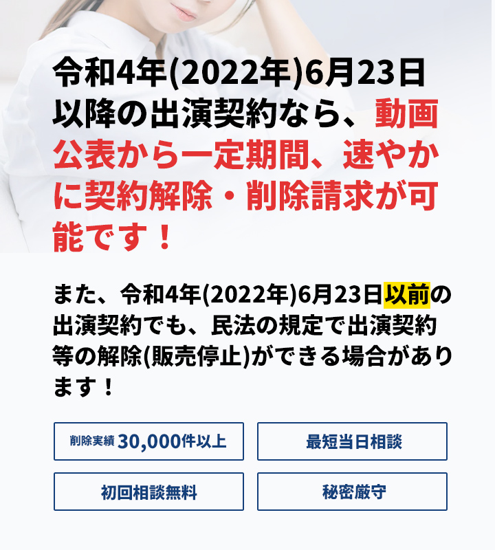 したがって、令和4年6月23日以降に締結された出演契約等であれば、AV出演被害防止・救済法の適用によって、無条件に出演契約を解除し、販売や配信の停止、動画の削除などを実現できる可能性があります。