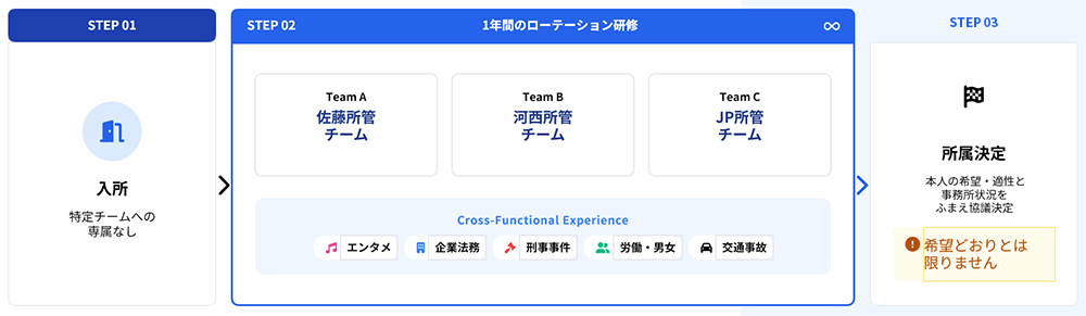 - ・1年間の研修期間終了後、本人と事務所側で協議を行い、最終的な所属チーム(佐藤所管、河西所管、JP所管のいずれか)を決定します。